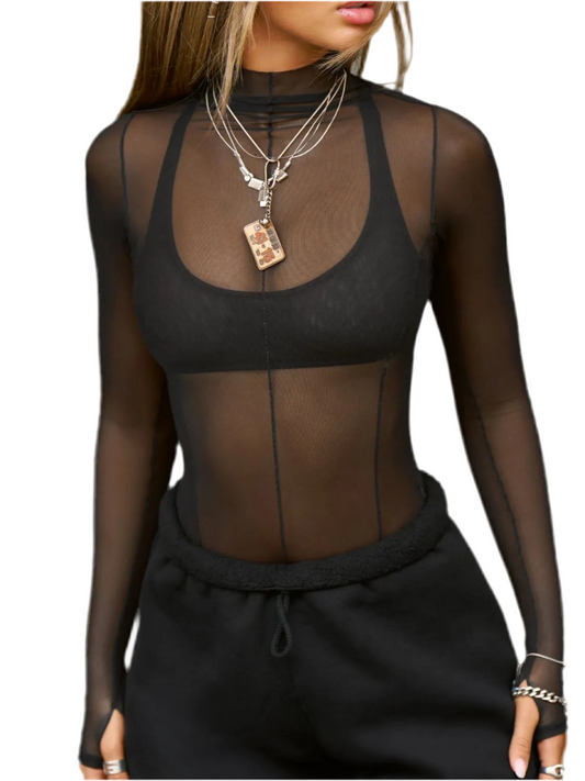 Sheer Floral Lace Mesh Mock Neck Long Sleeve Top