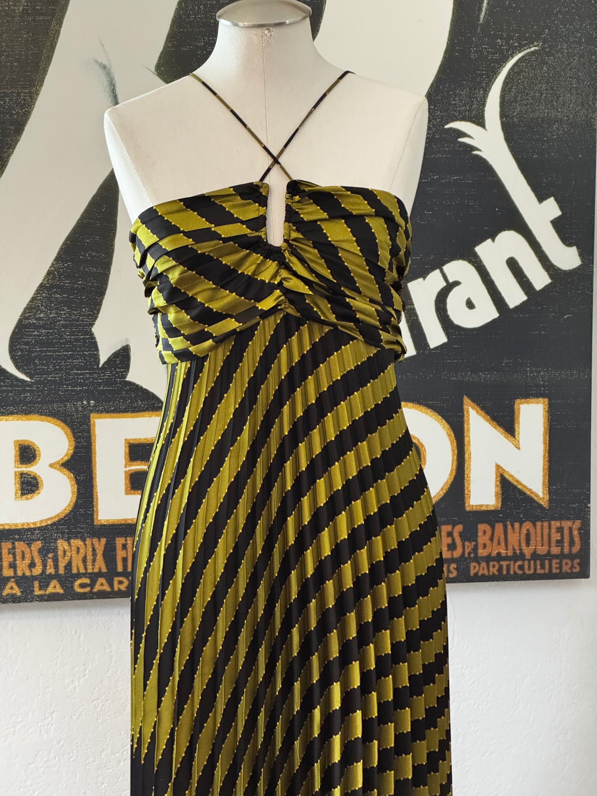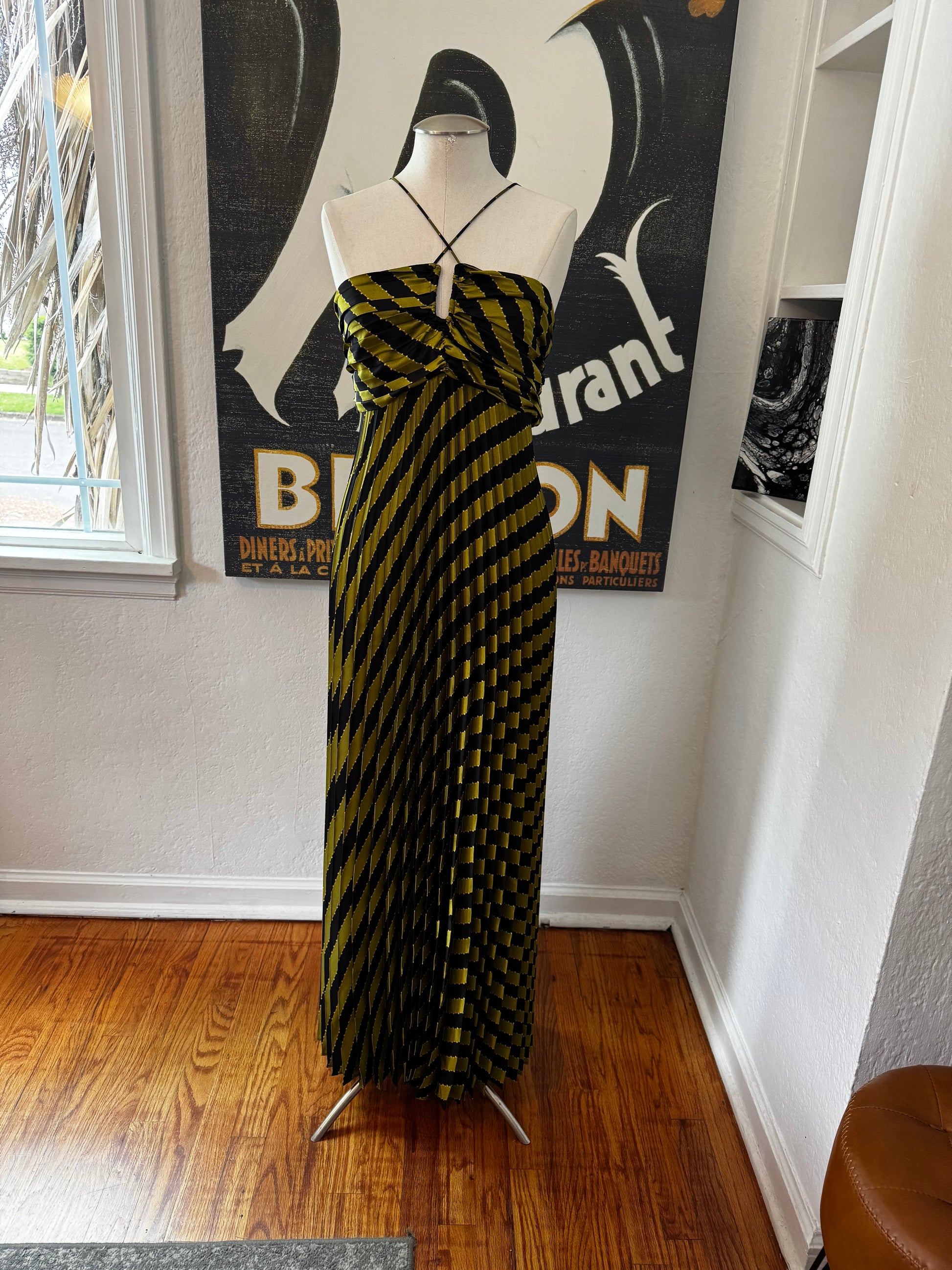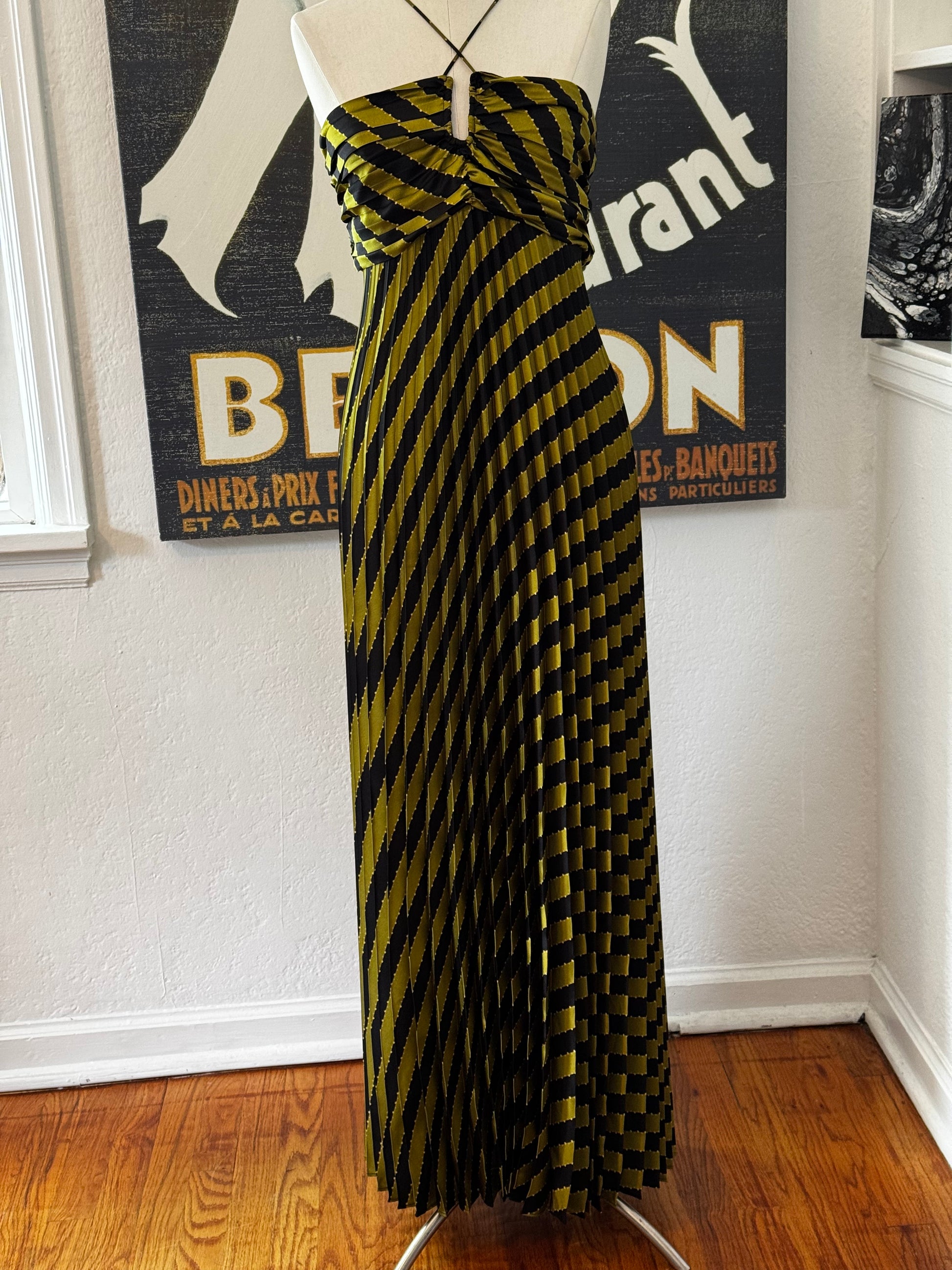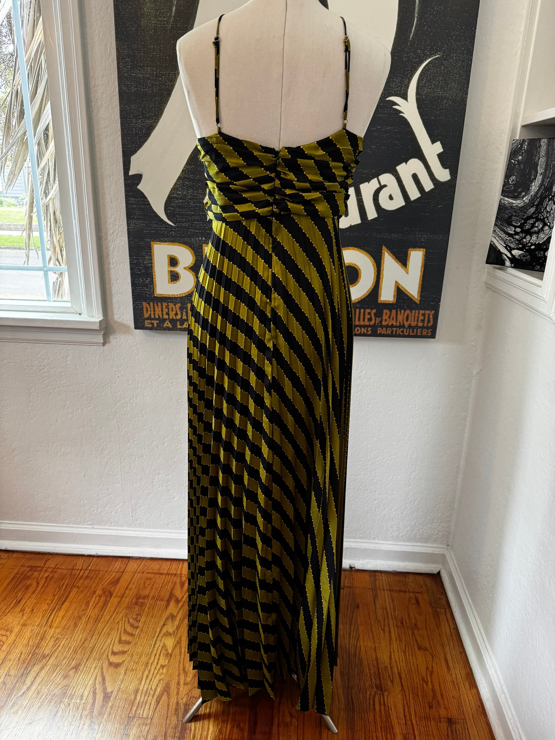 Unleash your bold and daring side with the ASTR Statement Dress. This art deco-inspired dress features eye-catching olive and black stripes, perfect for making a statement at any party or event. With its unique pleated design and red carpet-worthy style, this dress is sure to turn heads and make you feel like a celebrity. Take a risk and stand out from the crowd with the ASTR Statement Dress.
