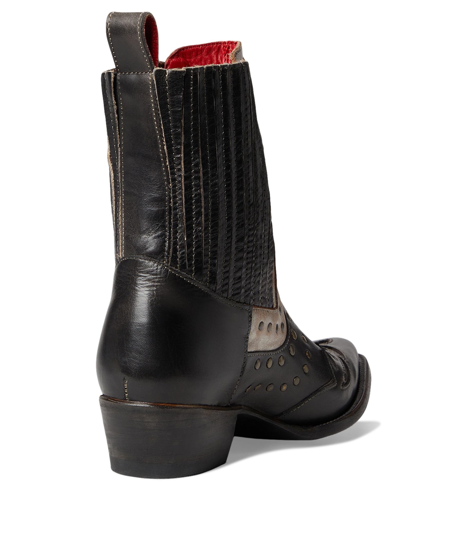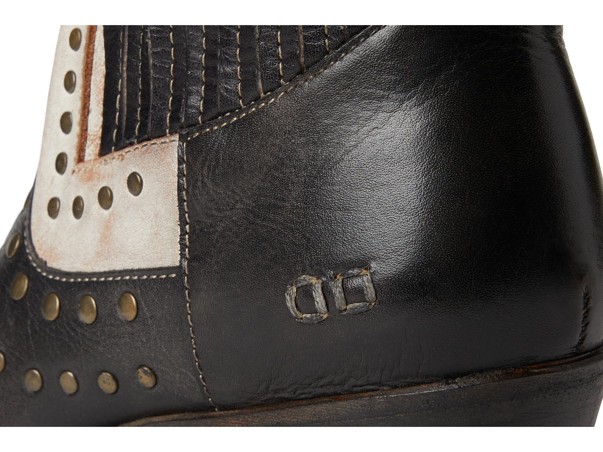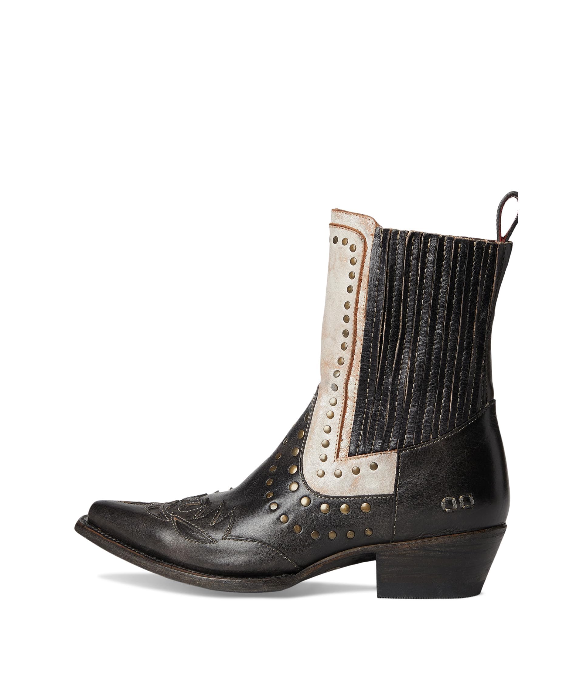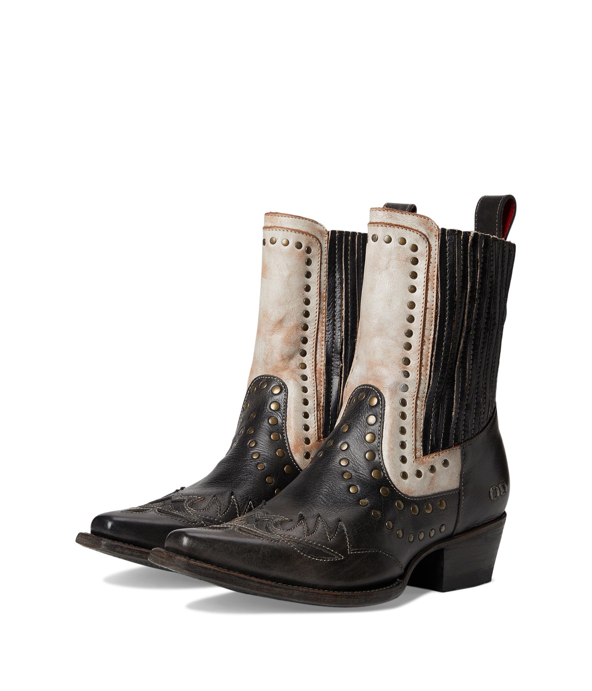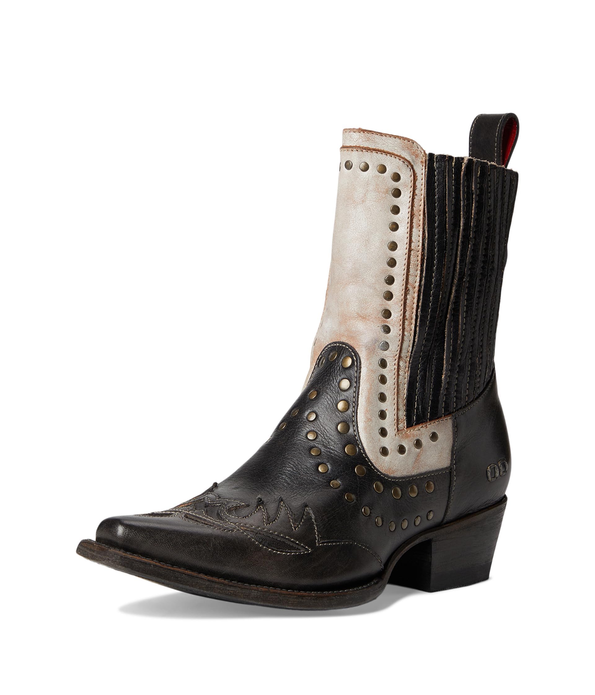 Bed Stu Raise Western Boots are a playful twist on a classic Western-inspired boot. With its vibrant color combinations, studded accents, and signature Western stitching, this short boot is all about making a statement. The snip toe design adds a touch of traditional flair, while the hidden stretch goring ensures easy on-and-off for effortless everyday wear - combining modern style and functionality with tried-and-true Western construction. Crafted from vegetable-tanned leather upper, breathable leather lining, and leather insole. Goodyear welt construction provides excellent durability and flexibility. Pull-on design. Hidden goring for a flexible fit. Pull tab on the back shaft. Block heels. Leather outsole.