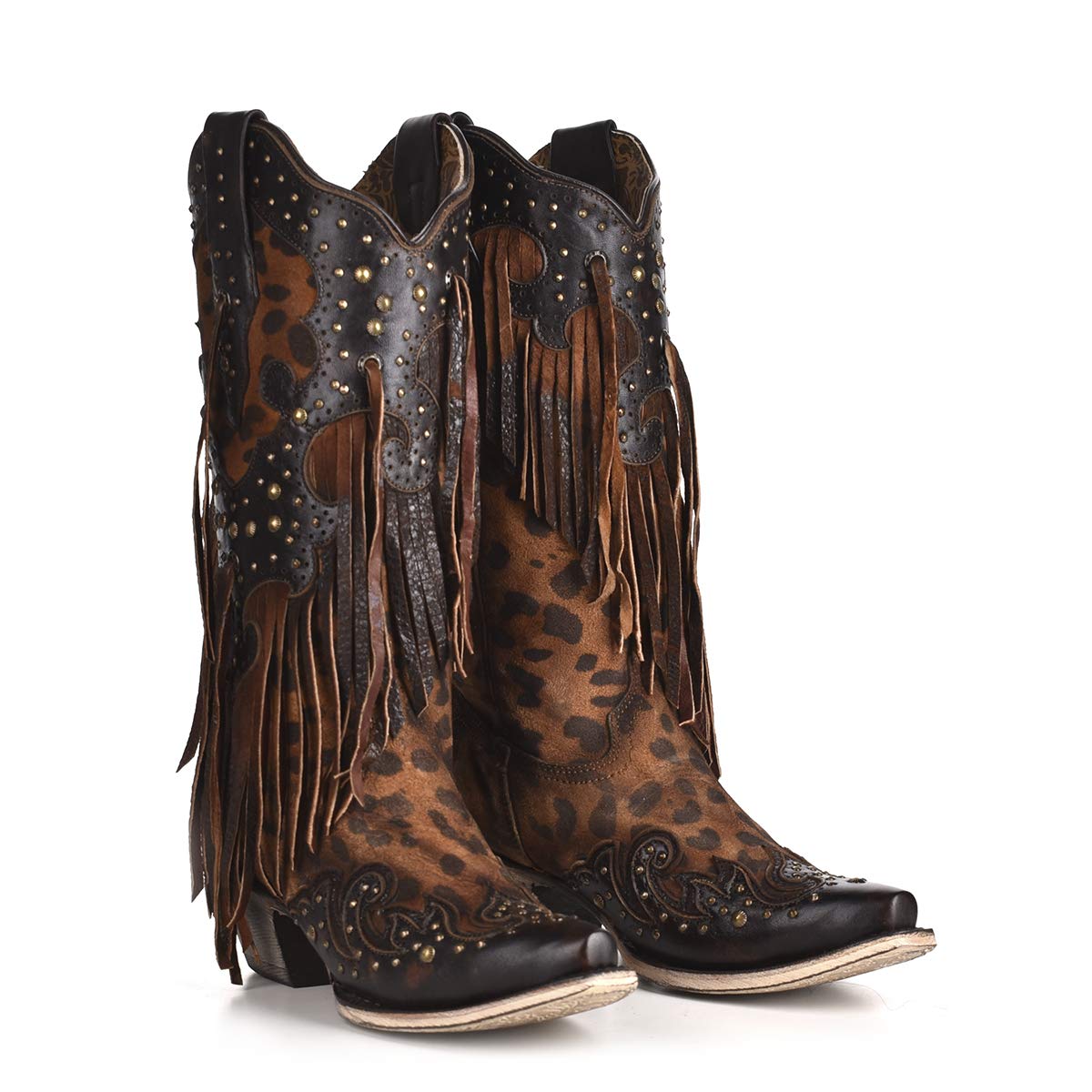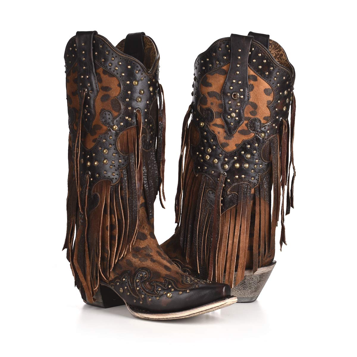 We are wild about this show stopping style from Corral! This new arrival features a fun leopard print with fringe and stud accents snip toe and is constructed from genuine leather. We love this dressed up with a dress or down with your denim for a trendy western flair! Please note that if you are ordering boots, the leather process and distressing is normal. Each boot is hand stitched and is individually unique. All our boots have been thoroughly inspected for true "defects" by the manufacturer and our staff. If you have questions about any pair of boots please contact our stylists for additional information.