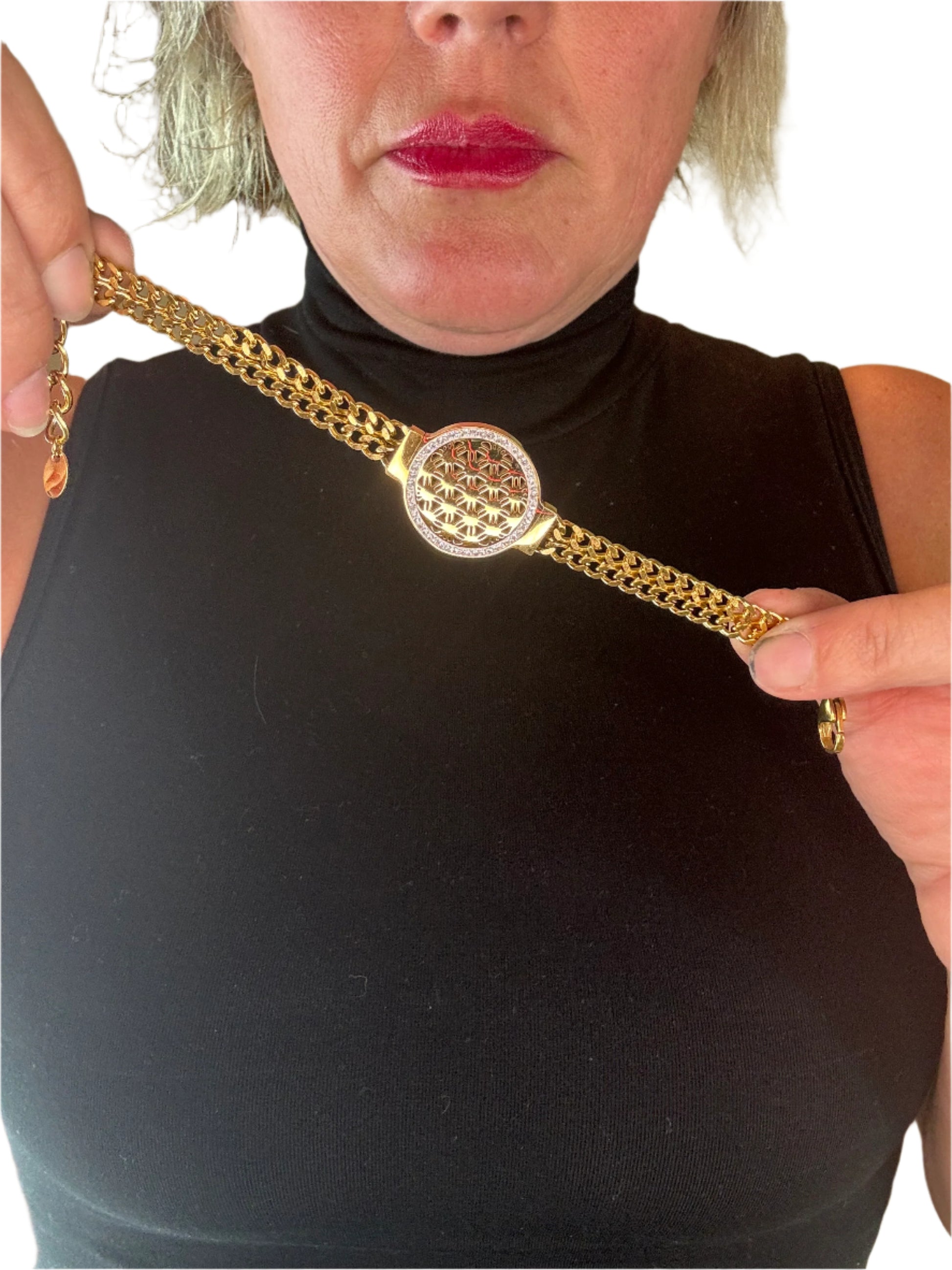 This sophisticated bracelet complements the legacy necklace in both form and function. Its weight and design exude elegance, reminiscent of a vintage watch.