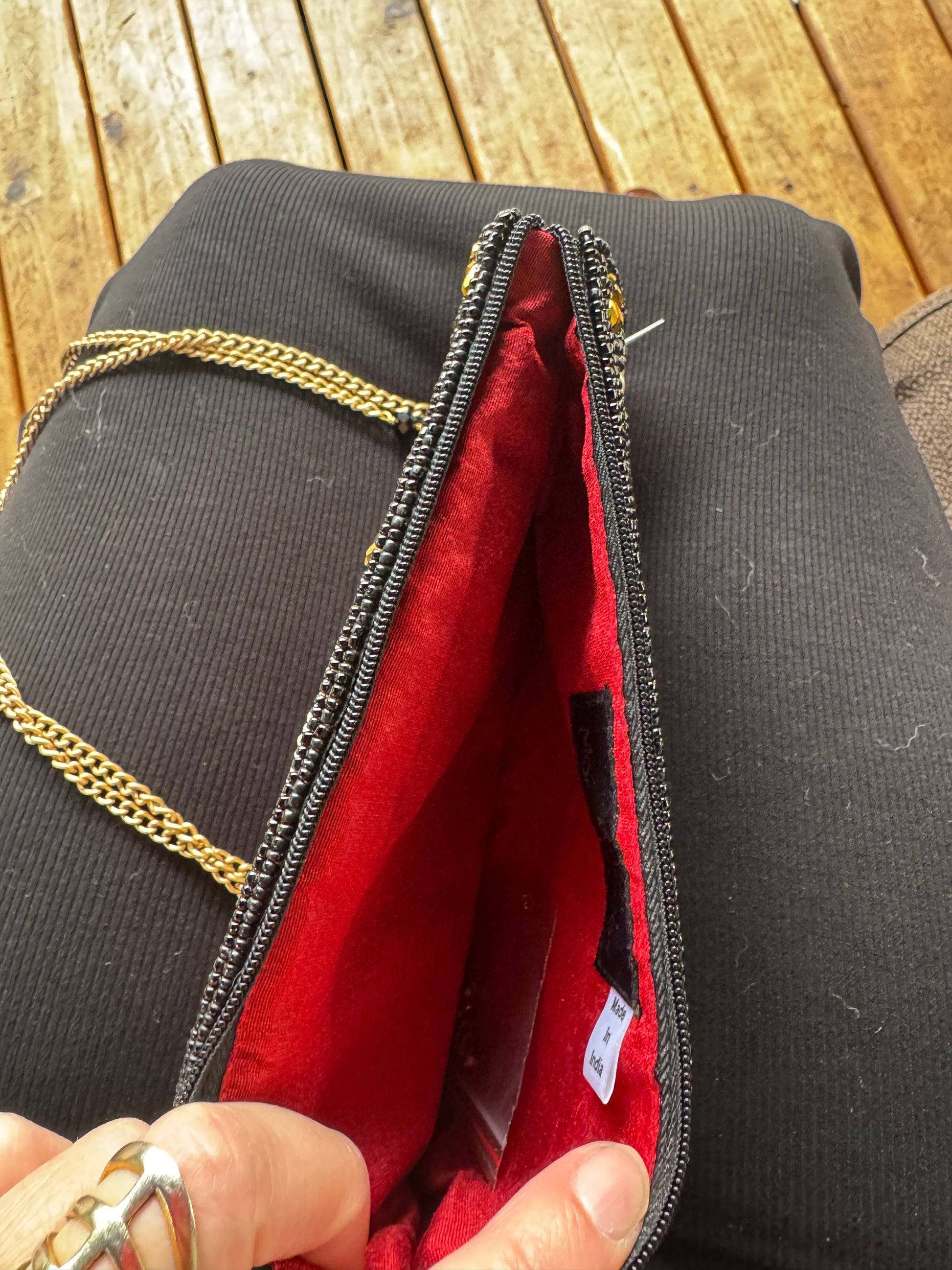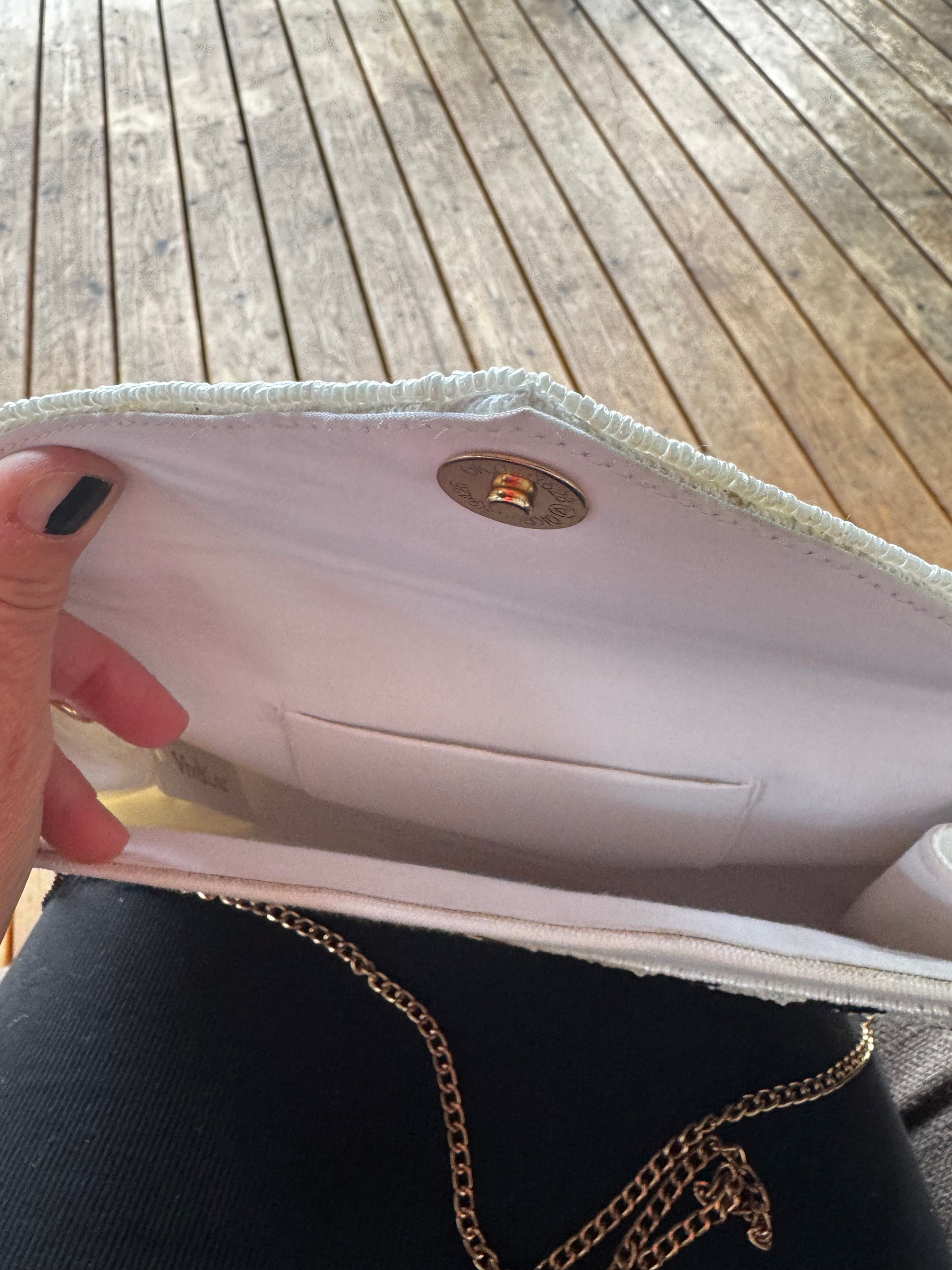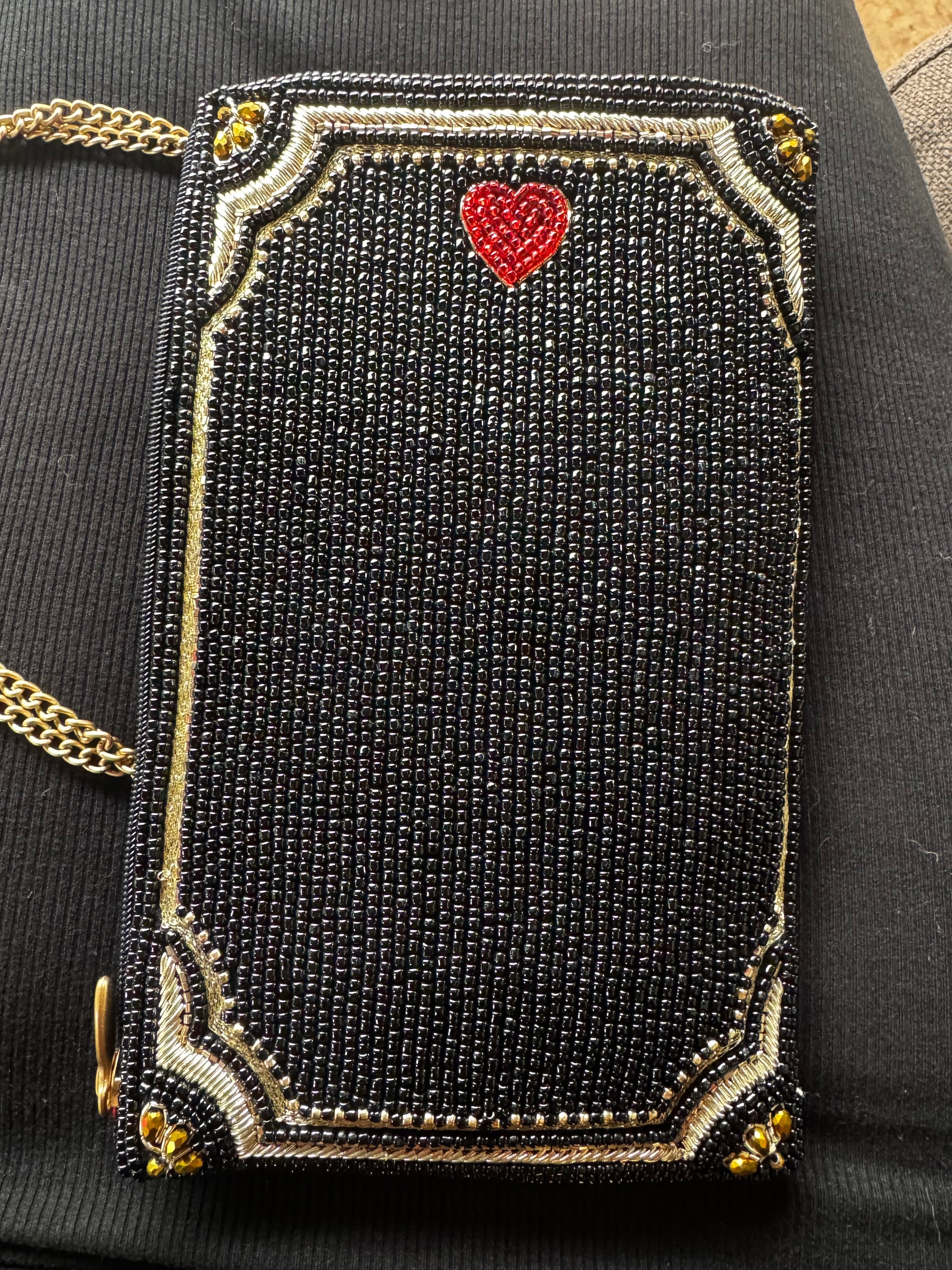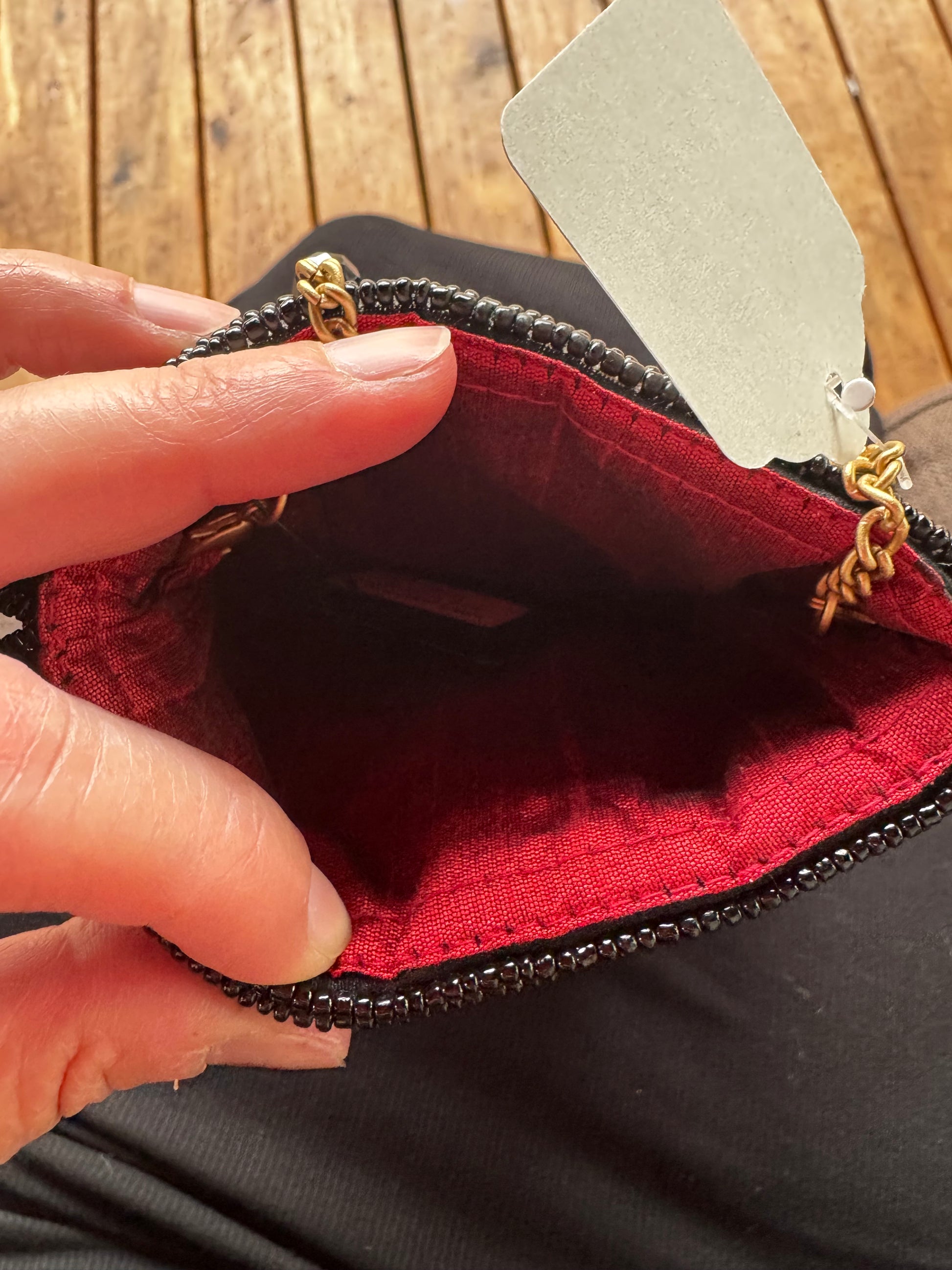 HHand beaded and cute as can be. Side zipper pocket and top drop in phone holder.