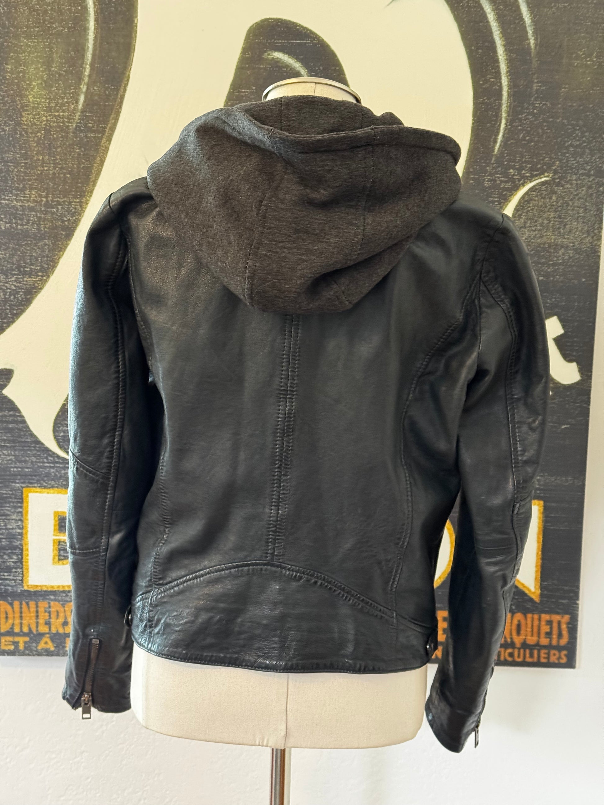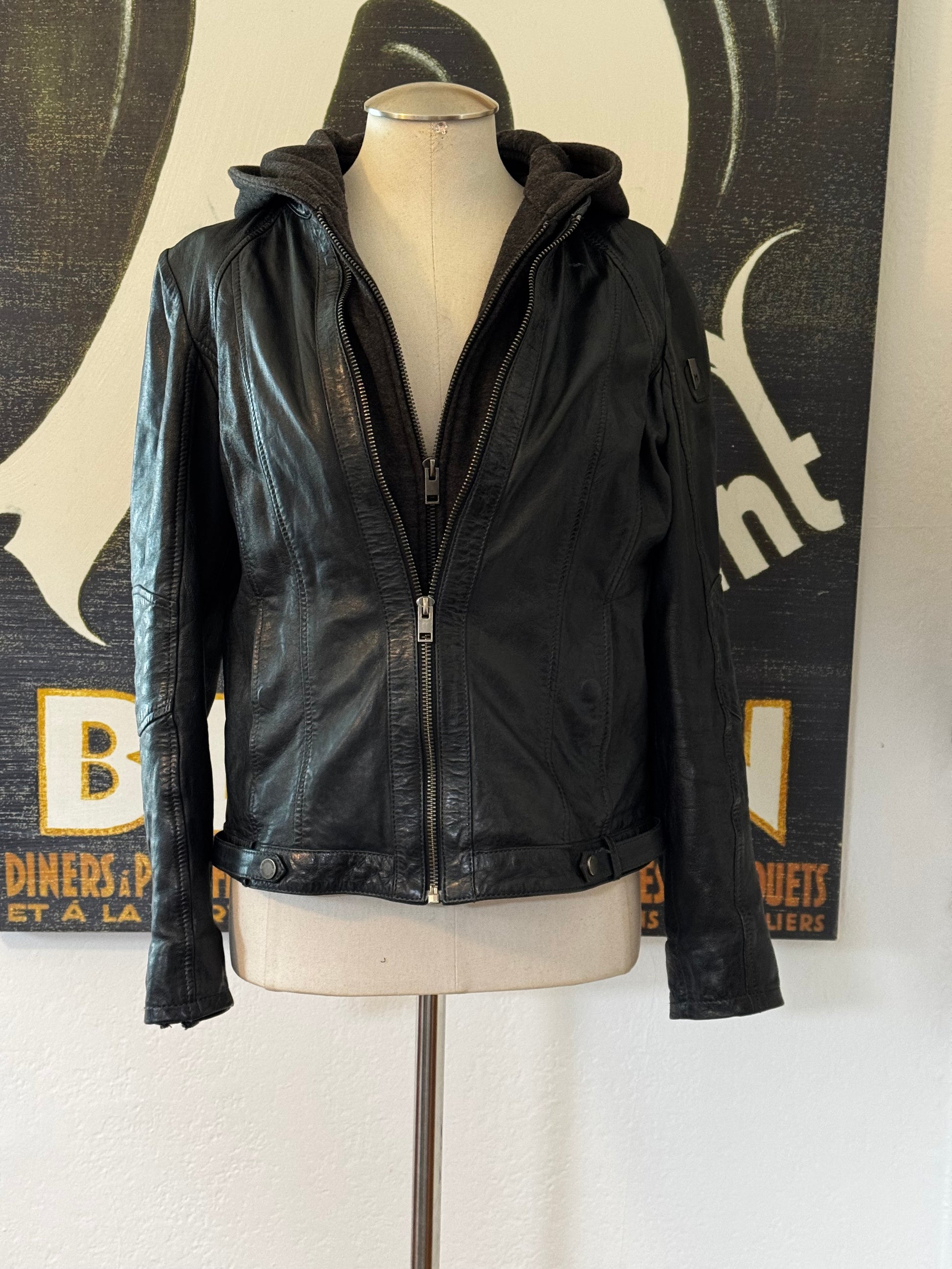 Introducing the playful Mauritius Leather Jacket! Made from genuine lamb skin, this jacket features a dark blue color with a zip out grey hood and liner. With a versatile size large, it can fit like a medium for a comfortable and stylish fit. Size large, fits like a medium.