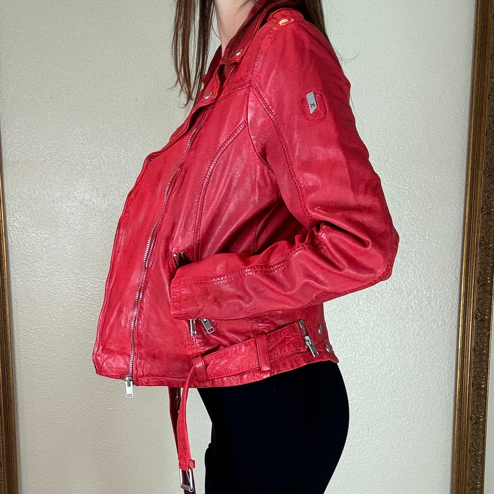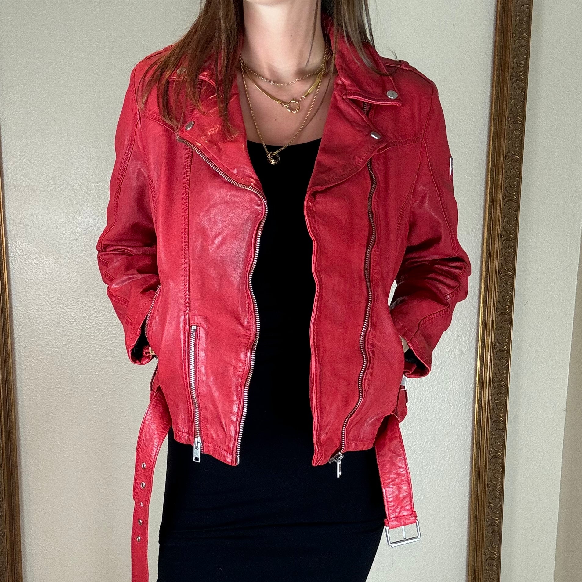 This jacket is more than just a classic piece - it's the perfect way to spice up your style and stand out among the crowd. Made with genuine German leather and in a trendy lipstick red, it's the ultimate fall fashion statement. European sizing runs small, recommended to size up one size.