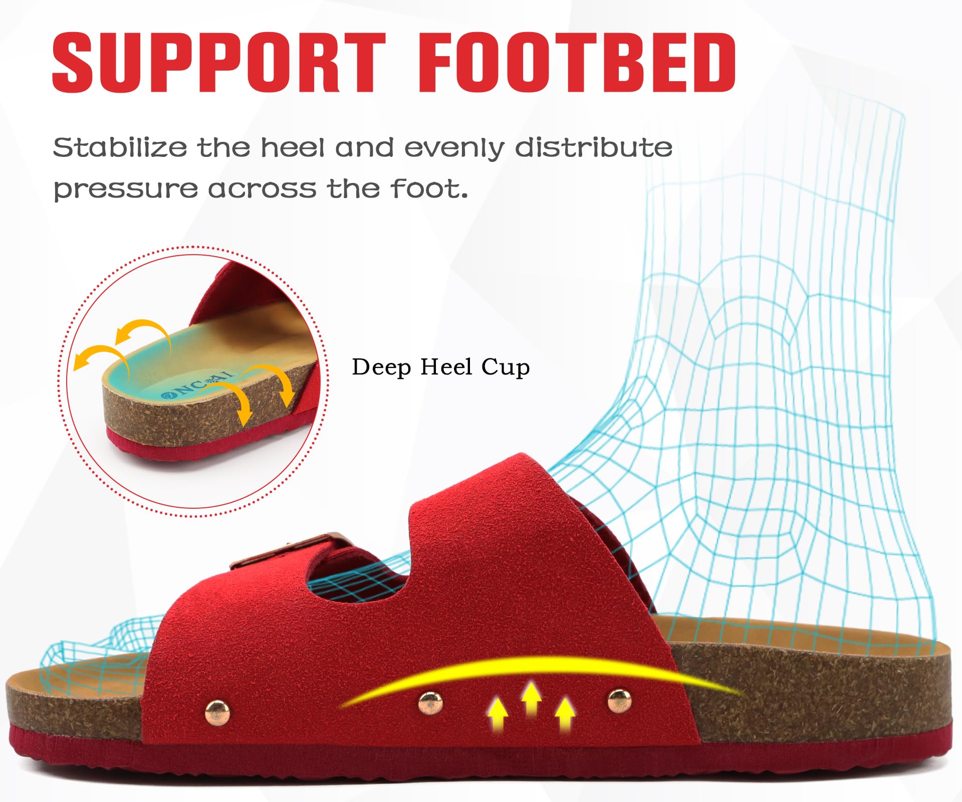 - Arch support padding - platform tread consists of rubber outsole and cork midsole & insole. Flatform soft footbed is supportive, with ergonomic arch support and heel cup design provides a lightweight comfortable walk.