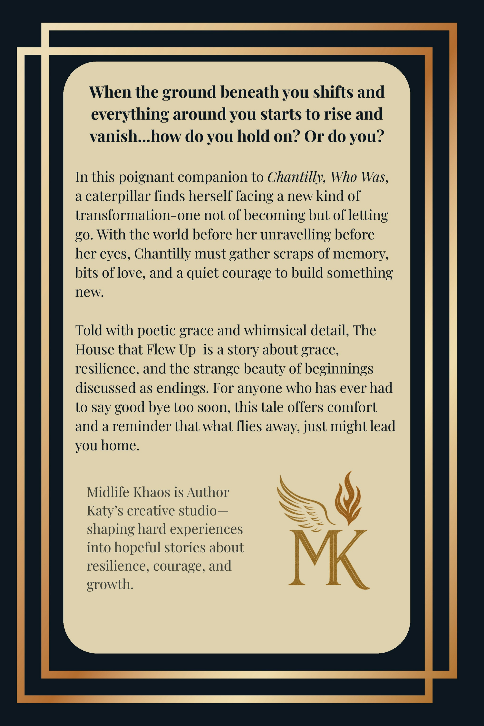 In this second book of the Chantilly series, Chantilly’s world quite literally falls apart. When everything she knows is swept away, she faces the pain of losing what she thought would last forever. Through the wreckage, she learns that sometimes life’s greatest changes come without warning—and that rebuilding begins with trust: in herself, in timing, and in the unseen hands guiding her forward. The House That Flew Up is a story of loss, surrender, and the quiet courage it takes to start again.