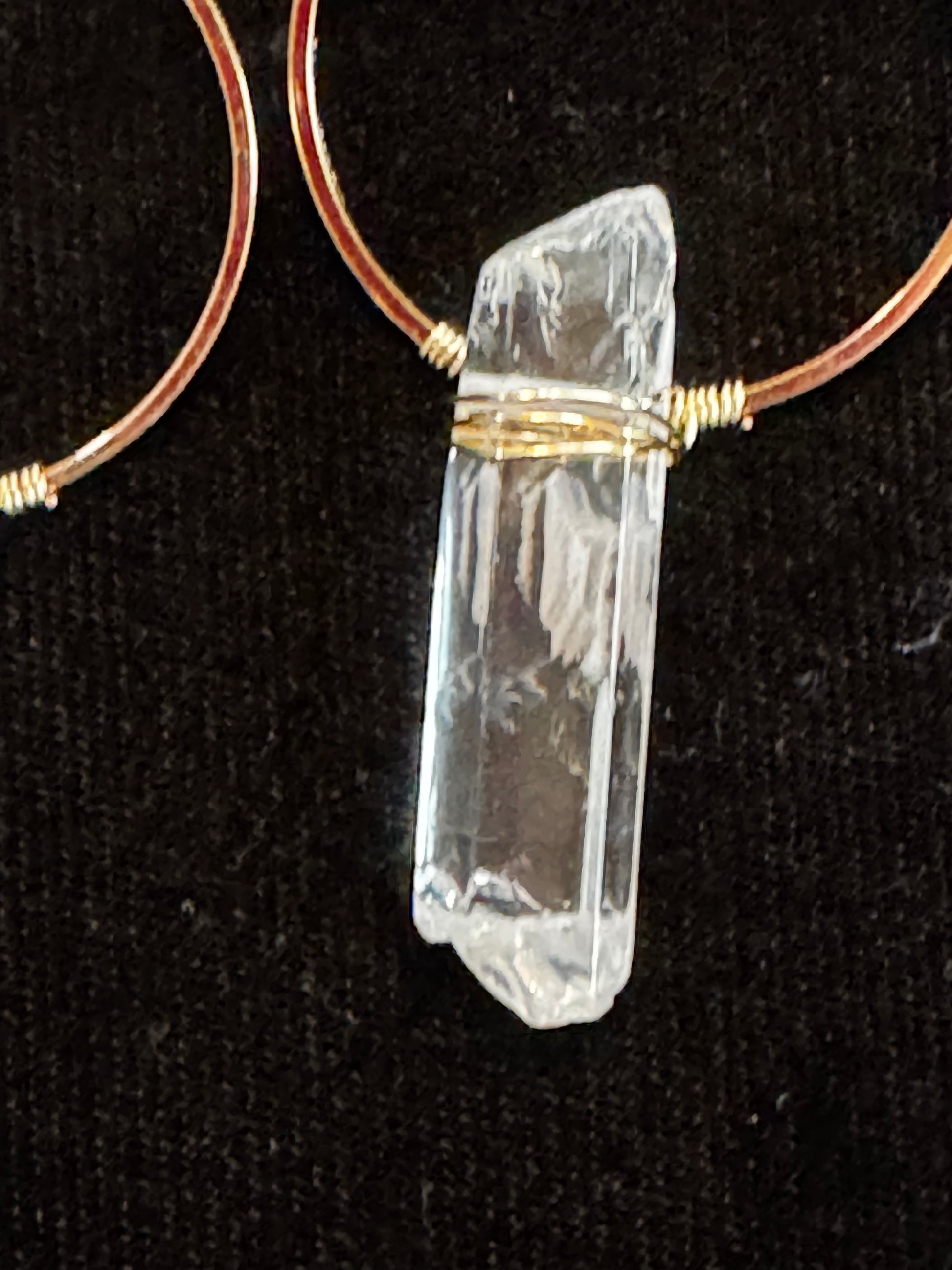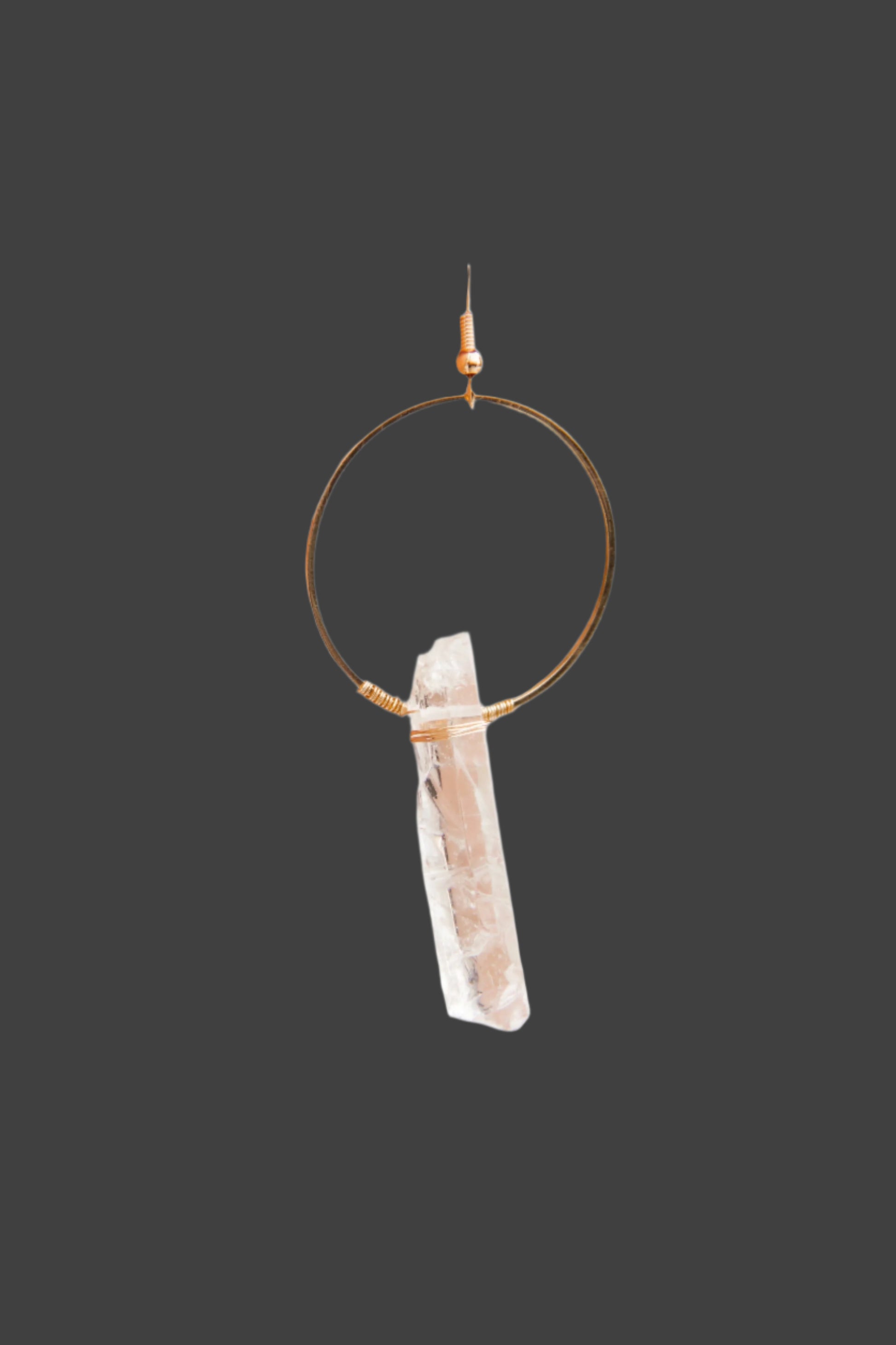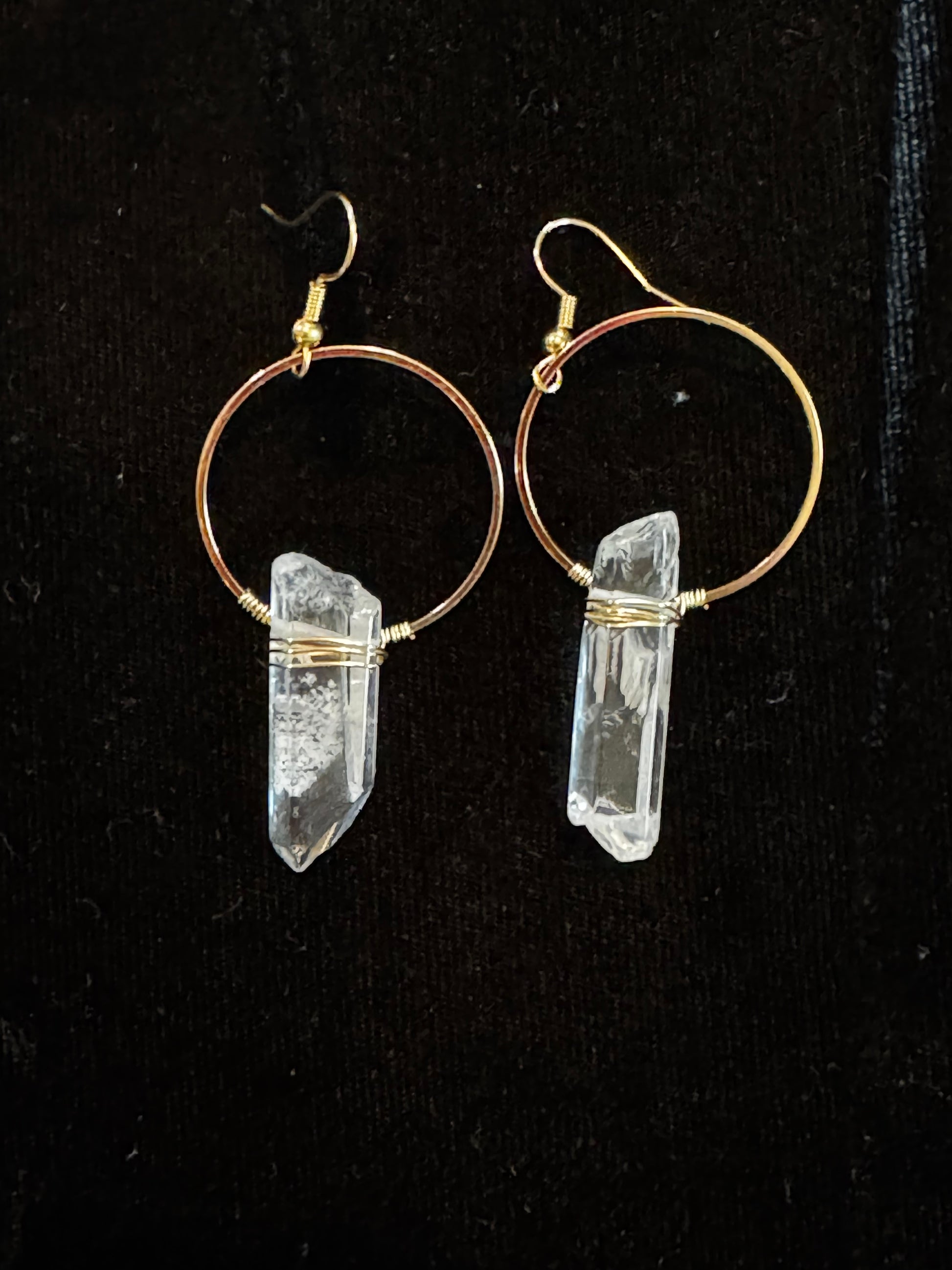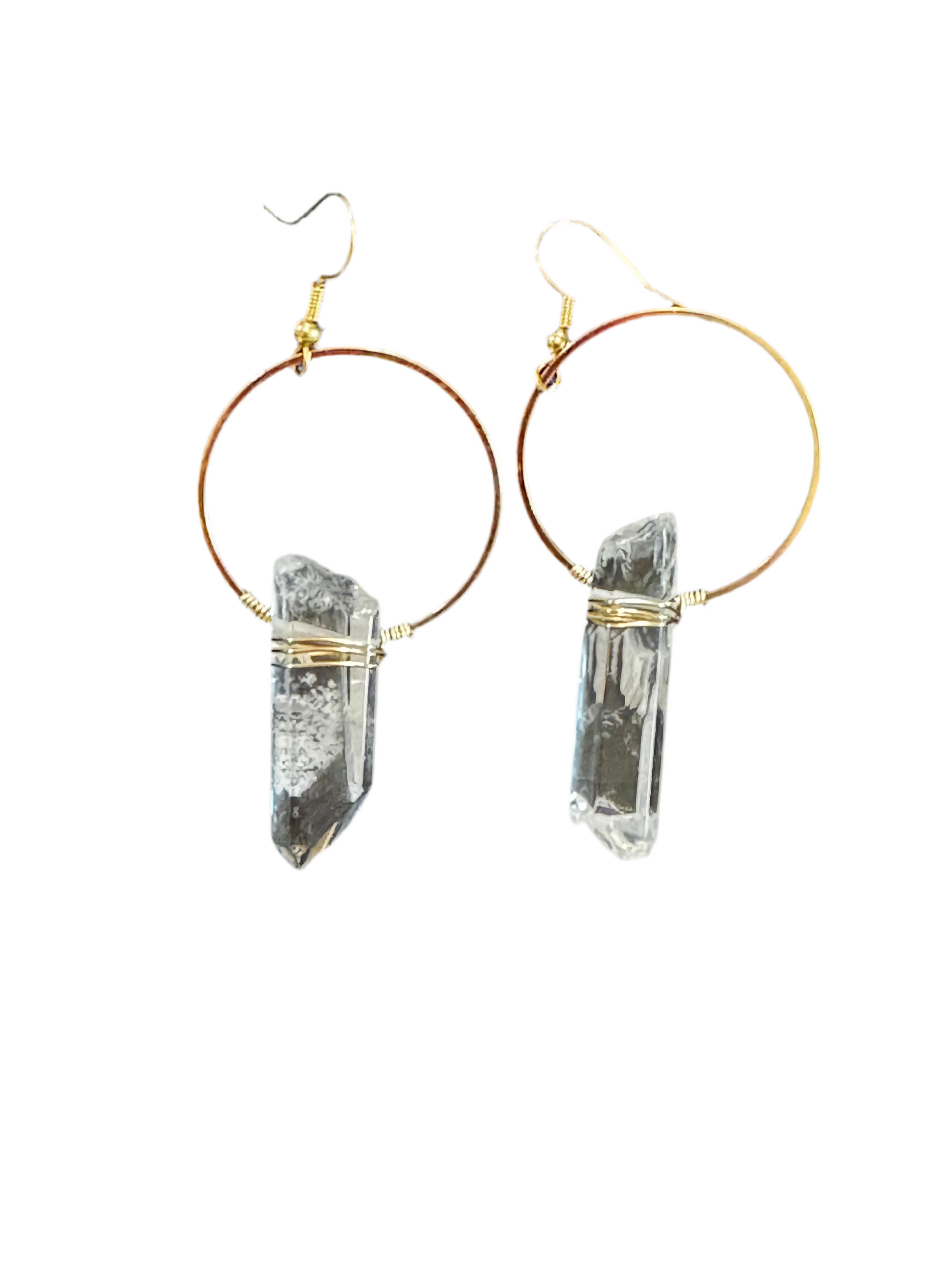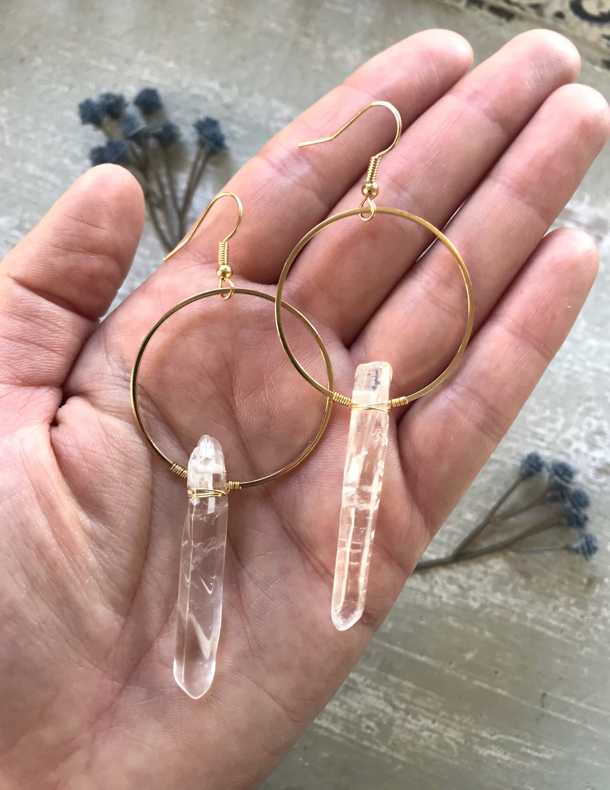 This listing is for one pair of gold front facing hoop earrings featuring a raw Brazilian quartz pendant bead wire wrapped by hand around a gold plated brass frame.Please note that each pair is made to order and the quartz are genuine and unique so they may vary slightly in size or color from what is pictured. The measurements are approximately 2.75" long and 1.0" inch wide. The hooks are lead and nickel free and should be suitable for sensitive ears.