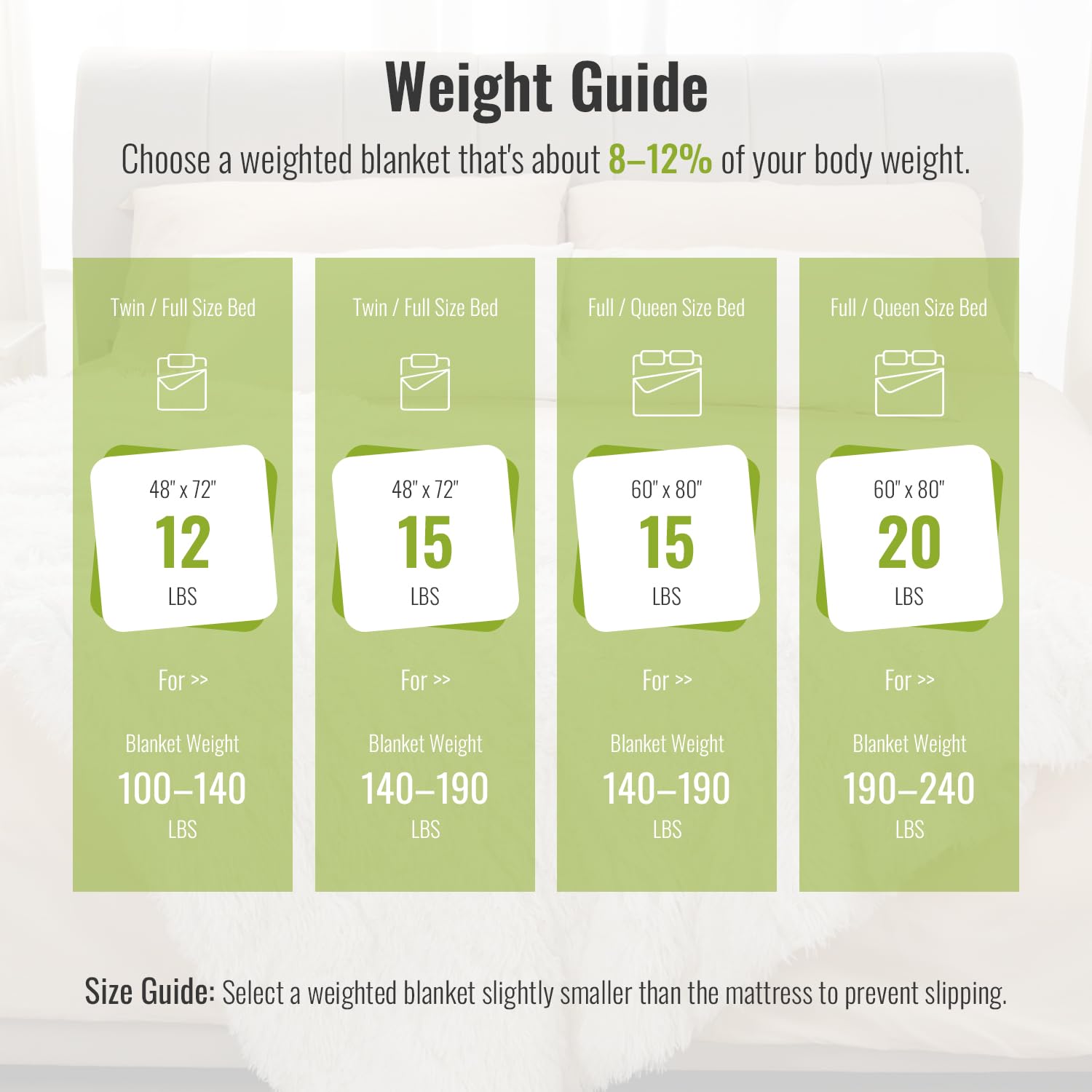 - Choose your Blanket Wisely: It is recommended to choose a weighted blanket that weighs 10% of your body weight. But for starters, we suggest you to choose a lighter weight. It may take 3 to 5 days to get used to the weight. Weighted blankets with dimensions of 60" x 80" 15lbs are suitable for 140-190 lbs individual use