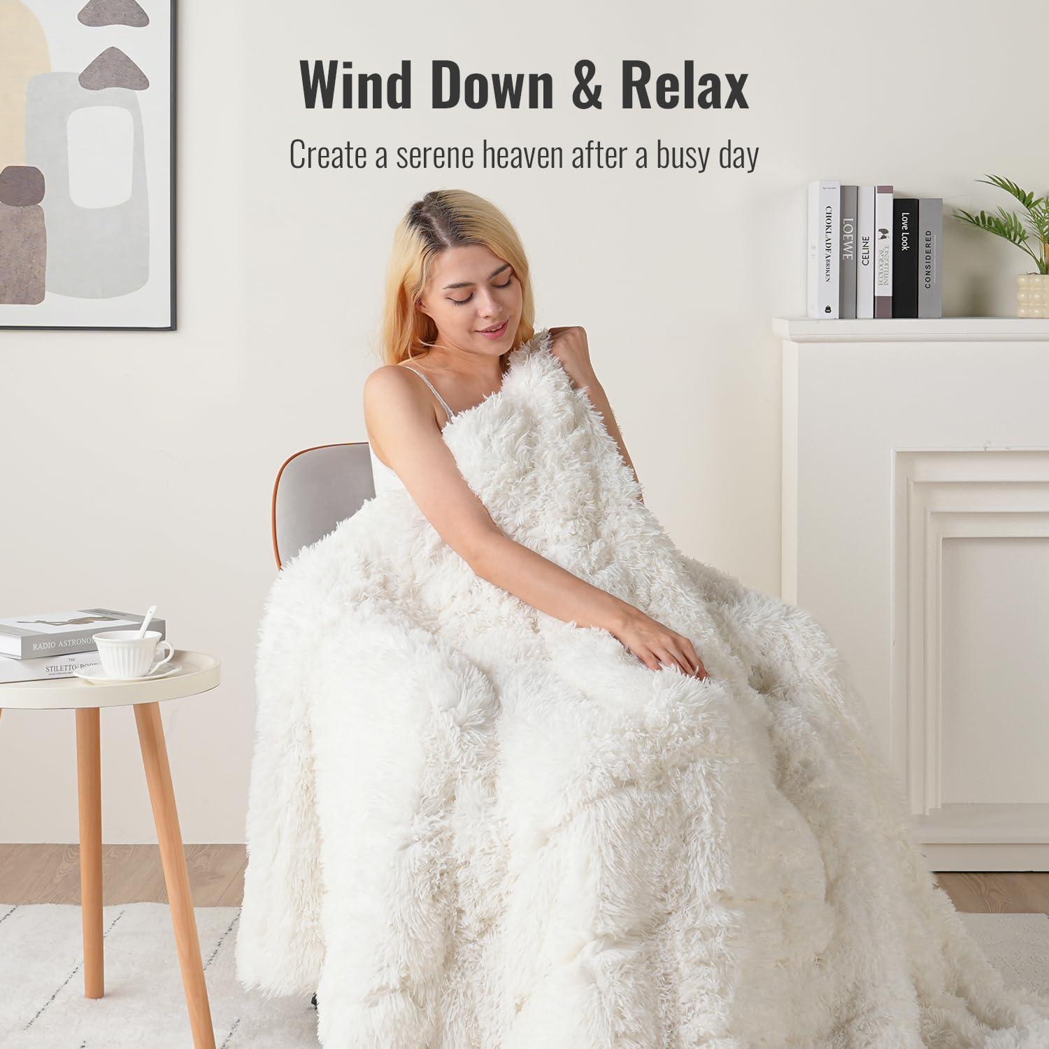 Uttermara Shaggy Faux Fur Weighted Blanket 15lbs, Super Soft Plush Fleece and Cozy Sherpa Reverse, Decorative Long Fur Throw Blankets 60"x80" Cream